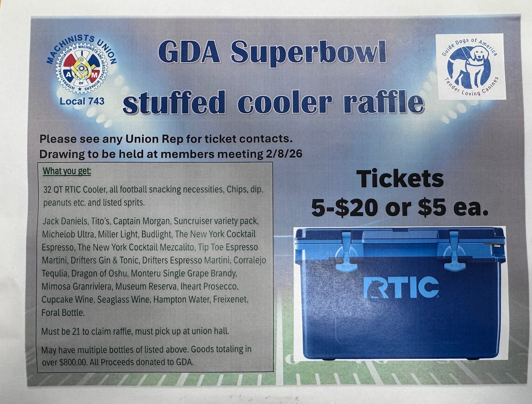 743 GDA Cooler Raffle January 13, 2026 GDA, LL743 Please see any of the following Reps: Bldg 1: Greg Hess and Ryan Raffia on 1st Shift / Alex Schaller on 2nd Shift Bldg 2: Chrissy McCormick on 2nd shift / Jody Cairo on 1st shift